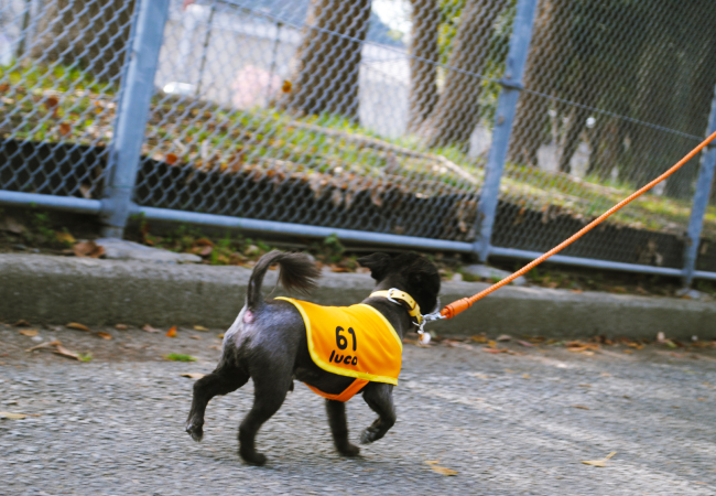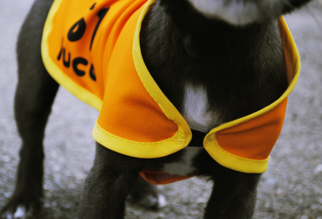 上から被せてベルトで止めるだけなので、普段着ている服の上からでも着せることが出来ます。散歩の時、犬は地面に近いところを歩いたり走ったりしているので、埃や花粉等、目には見えない汚れが付着します。ゼッケン風ウェアをカバーとしてご利用いただければ、汚れの防止にもなります。