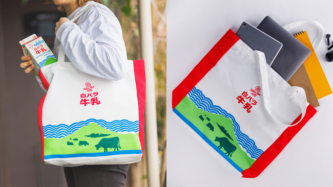 白バラ牛乳のデザインをそのままあしらったトートバッグ。