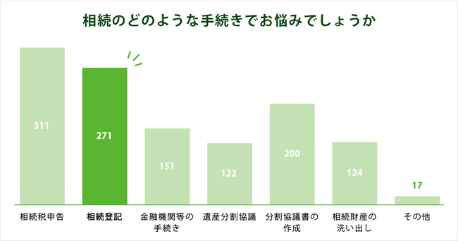 また辻・本郷 ITコンサルティング株式会社が実施したアンケート(※2)では、相続にあたって困る手続きとして「相続登記」を上げた人の割合が約67%、相続手続きにあたり困ることについて「何から手を付ければいいかわからない」と答えた人が約60%、「各種手続きが大変」と答えた人が約57%、「かかる費用が高い」と答えた人が50%にのぼりました。相続にあたって、相続登記が課題に上がりやすいことに加え、手続きの方法が分からない、もしくは手続きの負担が大きいことが明らかになっています。
