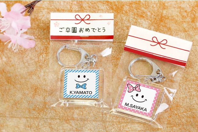 ラッピングせずにそのまま渡すことができる透明ビニール入り。さらに「ご卒園おめでとう」「おめでとうございます」の2種から、お祝いシールを選ぶことができます。(キーホルダーはラッピングのヘッダーになります)