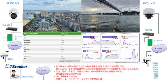 「TStockerクラウドサービス」は、現場にネットワークカメラを設置し、並行設置する気象計を用いて映像データと温度・湿度・WBGT等の数値を同時表示して閾値設定をすることで関係者に様々な告知をすることが可能となります。