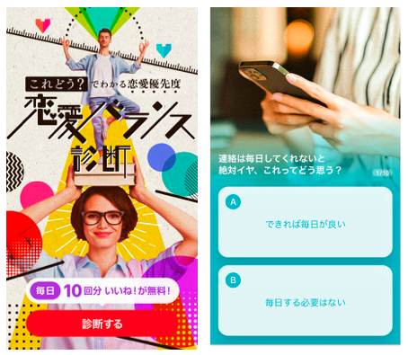 さらに、 『with』アプリ内において「これどう?展」と連動した新イベント「これどう?でわかる恋愛優先度『恋愛バランス診断』」を2022年4月22日(金)16:00から2022年5月8日(金)24:00まで開催いたします。