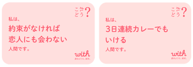 コロナ禍で生活変容や多様化が進む中で、恋人やパートナーを選ぶ基準が外見や肩書きではなく、「内面」や「価値観」を重視する傾向が見られます。※1 一方で多くの人が自分が重要視している価値観が分かっていなかったり、自分と恋人との間で、重要視している価値観に差異が生じている人は実は多いと考えられます 。そこで、心理学や統計学をベースにしたオリジナルの性格・価値観診断から2,000万以上のデータを蓄積する、恋活・婚活マッチングサービス『with』は、自分や相手の恋愛価値観をもっと知ってもらうための場所として「これどう?展」を企画しました。
