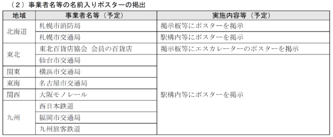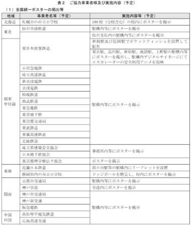 鉄道事業者(29社局)及び協会(4団体)、札幌市(199校)及び静岡県内の市立小学校、札幌市消防局、神戸空港等のご協力をいただき、ポスターの掲出等を表2のとおり実施します。なお、実施開始時期及び掲出期間は、各事業者によって異なります。