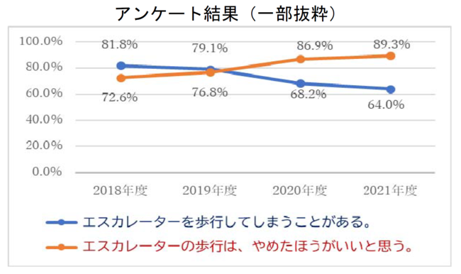 昨今、埼玉県の条例として施行されたことでも注目されている、エスカレーター上の歩行について調査したところ、「エスカレーターの歩行は、やめたほうがいいと思う」人の割合は毎年増えており、2021年度は89.3%に達しました。また、「エスカレーターを歩行してしまうことがある」人の割合は減少傾向で、64.0%となりました。