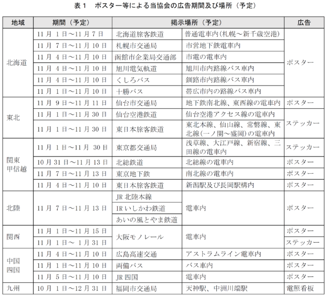 表1のとおり、全国20社局の鉄道車両等に全国統一ポスター、ステッカー、電照看板で広告します。