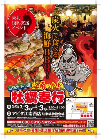 宮城県石巻の牡蠣をセルフ炭火焼き(海鮮BBQ)で楽しむ「出張カキ小屋 牡蠣(かき)奉行」(TEL 080-3916-9412)が3月3日、アピタ江南西店(愛知県江南市)駐車場特設会場に期間限定オープン。期間は3月3日~4月3日。