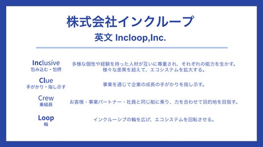 「インクループ (Incloop)」は「Inclusive」「Clue」「Crew」「Loop」の頭文字と音を掛け合わせた造語です。
