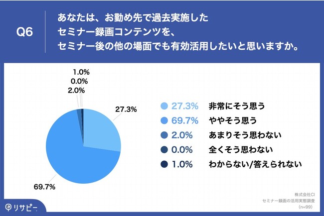 Q1で「毎回録画している」「たまに録画している」と回答された方に、「Q6.あなたは、お勤め先で過去実施したセミナー録画コンテンツを、セミナー後の他の場面でも有効活用したいと思いますか。」(n=99)と質問したところ、「非常にそう思う」が27.3%、「ややそう思う」が69.7%という回答となりました。