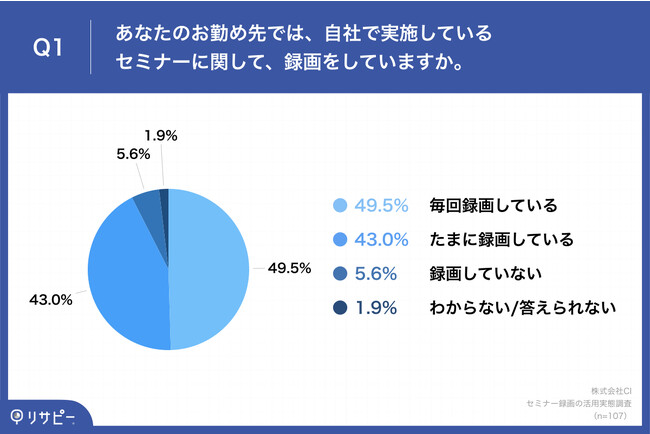 「Q1.あなたのお勤め先では、自社で実施しているセミナーに関して、録画をしていますか。」(n=107)と質問したところ、「毎回録画している」が49.5%、「たまに録画している」が43.0%という回答となりました。