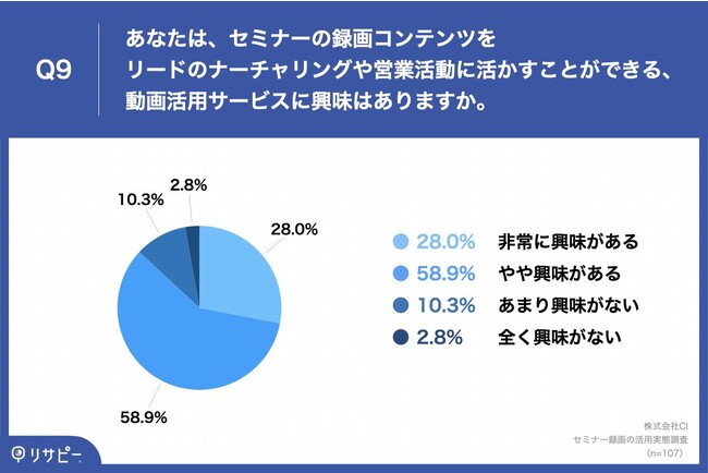 「Q9.あなたは、セミナーの録画コンテンツをリードのナーチャリングや営業活動に活かすことができる、動画活用サービスに興味はありますか。」(n=107)と質問したところ、「非常に興味がある」が28.0%、「やや興味がある」が58.9%という回答となりました。