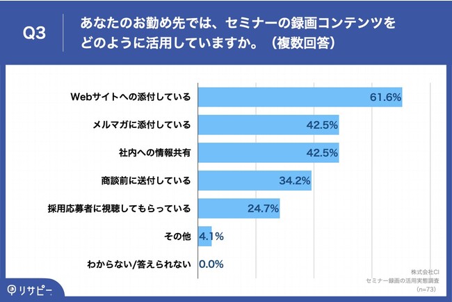 Q2で「非常にできている」「ややできている」と回答した方に、「Q3.あなたのお勤め先では、セミナーの録画コンテンツをどのように活用していますか。(複数回答)」(n=73)と質問したところ、「Webサイトへの添付している」が61.6%、「メルマガに添付している」が42.5%、「社内への情報共有」が42.5%という回答となりました。