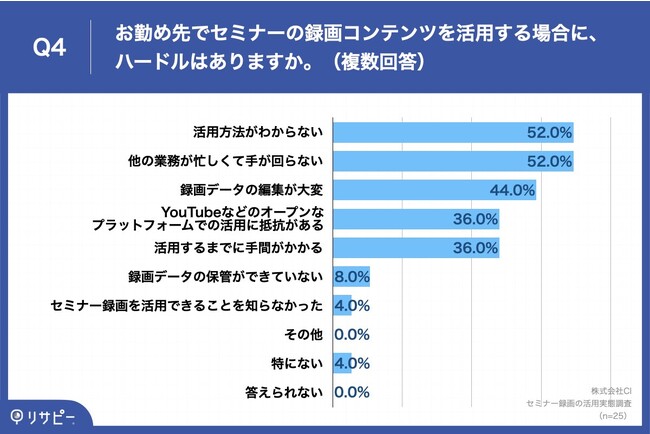 Q2で「あまりできていない」「全くできていない」と回答した方に、「Q4.お勤め先でセミナーの録画コンテンツを活用する場合に、ハードルはありますか。(複数回答)」(n=25)と質問したところ、「活用方法がわからない」が52.0%、「他の業務が忙しくて手が回らない」が52.0%、「録画データの編集が大変」が44.0%という回答となりました。