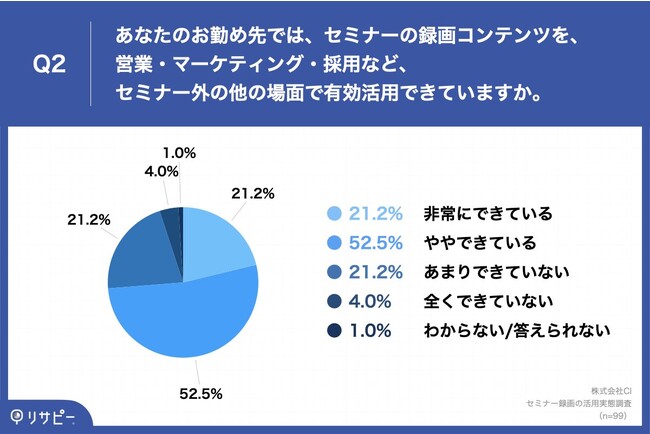 Q1で「毎回録画している」「たまに録画している」と回答された方に、「Q2.あなたのお勤め先では、セミナーの録画コンテンツを、営業・マーケティング・採用など、セミナー外の他の場面で有効活用できていますか。」(n=99)と質問したところ、「非常にできている」が21.2%、「ややできている」が52.5%という回答となりました。