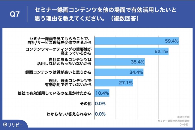 Q6で「非常にそう思う」「ややそう思う」と回答した方に、「Q7.セミナー録画コンテンツを他の場面で有効活用したいと思う理由を教えてください。(複数回答)」(n=96)と質問したところ、「セミナー録画を見てもらうことで、自社/サービス理解を促進できるから」が59.4%、「コンテンツマーケティングの重要性が高まっているから」が52.1%、「自社にあるコンテンツは活用しないともったいないから」が35.4%という回答となりました。