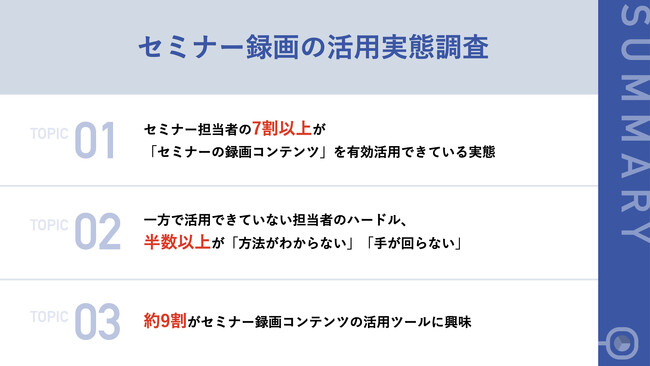 今回の調査では、過去実施したセミナー録画コンテンツを、他の場面でも有効活用したいと思っているが、効果的に録画を活用できていない担当者がいることがわかりました。これからは、リードのナーチャリングや営業活動に「セミナー録画コンテンツ」を活かすことが出来る「動画活用サービス」を活用することで、動画コンテンツに対するハードルが下がり、自社/サービス理解が進むことが期待できるのではないでしょうか。