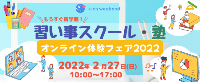 子ども向け「教育×オンライン」の分野では、日本最大級のプラットフォームである「キッズウィークエンド」(運営会社:キッズウィークエンド株式会社。本社:東京都中央区、代表取締役:三浦里江)は、2月27日(日)に「キッズウィークエンド 習い事スクール・塾 オンライン体験フェア2022」を開催します。対象は主に小学生とその保護者で、参加費は各講座・講演とも無料です。