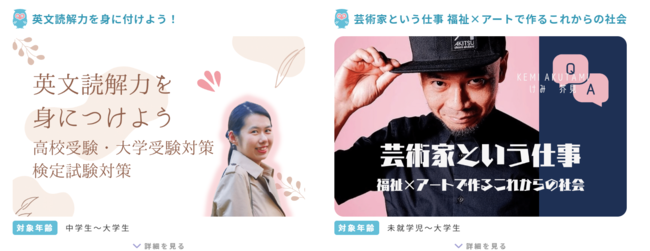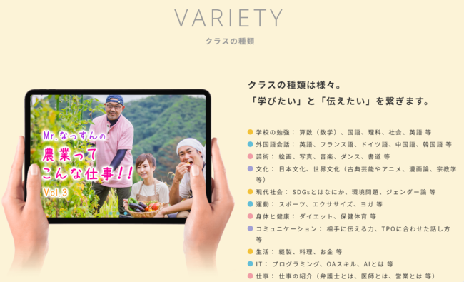 教員免許を持った方だけでなく、個人でも法人でも、スキルや経験を持った方なら誰でも、先生になることができます。国語、数学、英語等、いわゆる学校の勉強だけでなく、プログラミングスキルやコミュニケーションスキル、文化、更に職業紹介など、様々な分野で活躍いただける場となっております。