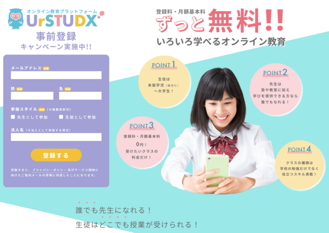 事前登録を受付中のオンライン教育サービス『UrSTUDX』にてサービス開始後にライブ講座を実施
