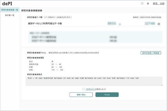 dePIは、大規模に集積したRWDを研究者自身で検索し、任意の研究対象を研究にご活用いただくシステムです。データ検索から研究完了までの個人情報管理を含むデータ管理はすべて当社にてサポートいたします。