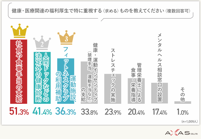 多忙を極める中でも資本となる身体の健康を保つために、『社食や食事手当の支給(51.3%)』、『人間ドックなどの法定外の健康診断(41.4%)』を求めている方が多いようです。