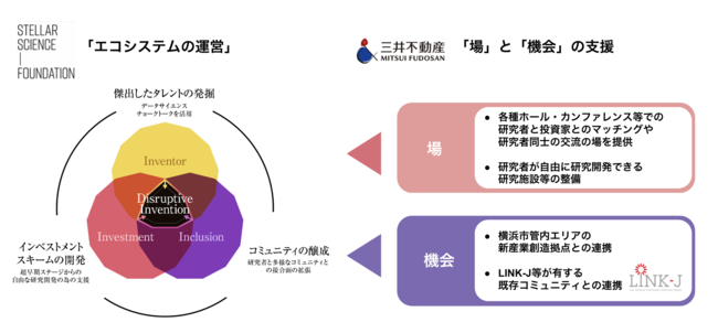 横浜市関内エリアで今後整備予定の新産業創造拠点を中心とした活動を予定。三井不動産と SS-F が連携し、超早期ステージからの研究支援体制を整えることで、研究者のインベンション活性化、新産業創造のエコシステム構築を目指す。