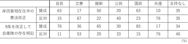 岸田首相の在任中の憲法改正に関しては、内閣支持派が「賛成」=53%・「反対」=20%、不支持派は「賛成」=36%・「反対」=56%と賛否の割合が逆転しています。他方、自衛隊明記のための9条改正は、比率自体に相違はあるものの、支持派も不支持派も「賛成」が多数を占めています。安倍政権時代には、憲法改正に関する態度が、内閣の支持・不支持を明確に弁別する要素となっていましたが、岸田政権をめぐる憲法意識は、位相がかなり異なると言えるでしょう。