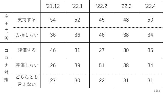 【表1】は、岸田内閣の支持・不支持と、政府のコロナ対策への評価について、推移をまとめたものです。21年12月と22年1月を除くと、コロナ対策評価と内閣支持・不支持が連動するという、いつもながらの関係が続いています。内閣支持率は3か月ぶりに5割に回復し、岸田政権は安定軌道に乗りつつあるようにも思われます。