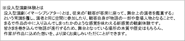 ◆備考2.:演劇中の撮影につきましては、撮影可能な場所を都度ご案内しますので、役者の指示に従ってご撮影いただきますようお願いします。なお、フラッシュ機能を用いた撮影はご遠慮ください。境内は撮影不可の場所もあります。