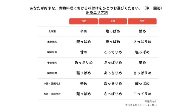 こちらも出身地域別に見てみると、じっくりと煮詰めた「こってりめ」とした味よりも「酸っぱめ」の風味が4つの地域でトップ3にランクインしました。次いで「さっぱりめ」の風味が好まれています。これは、若い世代でトマトやタコといった食材が好まれていることからも「酸っぱめ」「さっぱりめ」といった酸味を感じられる風味が好まれると考えられます。また、関東では「甘め」が1位となり、甘い味付けが関東のみなさまにも好まれる傾向にあるようです。