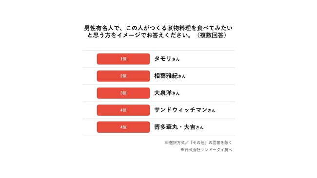 その結果、男性有名人では1位が「タモリ」さん、2位が「相葉雅紀」さん、3位が「大泉洋」さんになりました。タモリさんや大泉洋さんは芸能界でも料理上手として知られ、相葉雅紀さんはご自身が担当される番組で料理をする機会も多く、アンケート回答者のみなさんの「食べてみたい」という気持ちが反映された結果となりました。その他の回答では、同じく料理番組を担当された経験のある木村拓哉さんや、オリーブオイルの印象の強い速水もこみちさんなどの回答も目立ちました。