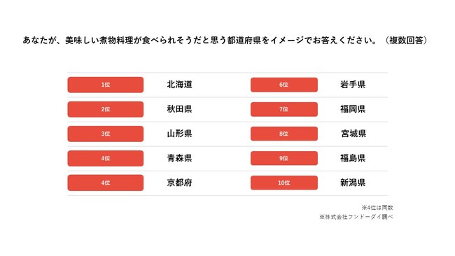 また「あなたが、美味しい煮物料理が食べられそうだと思う都道府県」をイメージで尋ねてみたところ、北海道が1位となりました。北海道は骨まで食べられる「カスベの煮付け」などが郷土料理として知られており、海の幸を使った煮物料理が多くあります。次いで、2位が秋田県、3位が山形県、4位が同着の青森県、京都府という結果になりました。