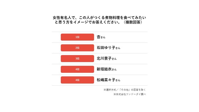 女性有名人では、1位が「杏」さん、2位が「石田ゆり子」さん、3位が「北川景子」さんという結果になりました。杏さんと言えば、ご自身のYouTubeチャンネルで料理動画をアップしており、昨年パリに移住後にアップしたクリスマス料理の動画が話題になるほど、料理の腕前は折り紙付きです。また、Instagramに料理の写真をアップしている石田ゆり子さんや、手料理を自身のブログにアップしている北川景子さんなど、手料理のイメージのある有名人が並びました。その他の回答では、料理研究家の鈴木登紀子さんやおしどり夫婦として人気の北斗晶さんといった方々のほか、松浦亜弥さんや藤本美貴さんといったアイドル活動をされている方々も並びました。