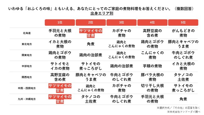 こちらも出身地域別に見てみると「サツマイモの甘煮」が3地域で高い割合となり、それぞれトップ5にランクインしました。また「その他」の回答を見ると新潟県の「のっぺ」や、福岡県の「がめ煮」、佐賀県の「のっぺい汁」といった郷土料理の名前が挙がりました。“おふくろの味”の煮物料理と聞いて、郷土料理の名前が挙がるのは、煮物料理の伝統性を感じられる結果とも言えます。