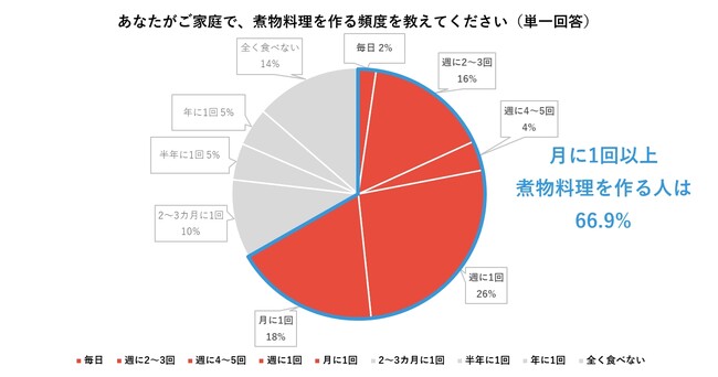 まず、家庭で煮物料理を作る頻度を聞いてみたところ「週に1回」が26.4%と最多でした。次いで「月に1回」が18.5%、「週に2~3回」が15.9%という結果になりました。そのほか「毎日」「週に4~5回」と答えた方々も合わせると、実に約65%以上の方々が月に1回以上は煮物料理を作っている、という傾向が伺えました。