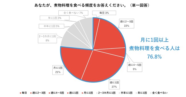 また、煮物料理を食べる頻度を尋ねてみたところ、同じく「週に1回」が最多の27.1%、次いで「月に1回」が20.8%、「週に2~3回」が20.5%という結果になりました。しかし「毎日」「週に4~5回」と答えた方々を合わせると約75%を超え、煮物料理を作る以上にスーパーやコンビニで買ったり、外食で食べたりなどしていることが伺え、生活者と煮物料理との身近さを感じられる結果になりました。