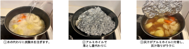 鍋にアルミホイルを広げた状態で入れて、10分置いておくと、灰汁がアルミホイルに付いて簡単に取ることができます。落し蓋代わりにもなって一石二鳥。煮物の調理がラクになります。