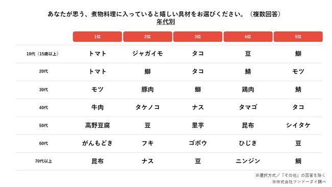 年代別に見てみると10代~30代は肉や魚、トマト煮などで人気のトマトなどが上位にランクインしているのに対し、40代以降は急に野菜や豆類、昆布といった具材がランクイン。よりヘルシーな食生活が好まれていると伺える結果となりました。