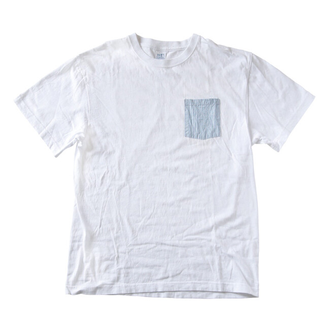 布地の端切れからポケットのパターンを切り出し、胸にあしらった、つぎはぎポケットTシャツ。