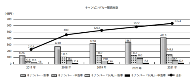 国内キャンピングカー販売売上合計額が新車・中古車を合計して過去最高「635.4億円」(対前年比109%)