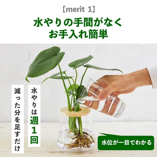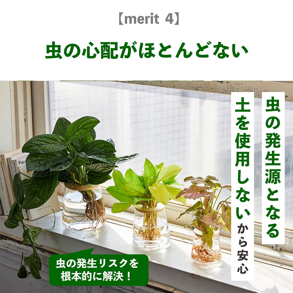 水やりは週1回、減った分を足すだけというシンプルなお手入れ方法や、土を使わないため虫の心配がなく清潔に保てること、どんな場所にも置ける手軽さなど、水耕栽培の魅力をわかりやすく紹介。初心者の方でも安心して植物を育てられる環境づくりを目指します。