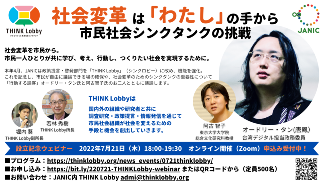 グローバルな社会課題解決に国内外で取り組む日本のNGOを支援する、NPO法人国際協力NGOセンター(JANIC)(所在地:東京都新宿区、理事長: 本木恵介)は、2022年7月21日(木)にオンラインにてシンポジウム「社会変革は『わたし』の手から 市民社会シンクタンクの挑戦」を開催いたします。ゲストに台湾・デジタル担当政務委員オードリー・タン氏、東京大学大学院総合文化研究科教授阿古智子氏を迎え、市民が自由に議論できる場の確保や社会変革のためのシンクタンクの重要性について語っていただきます。オンライン開催で参加費無料です。