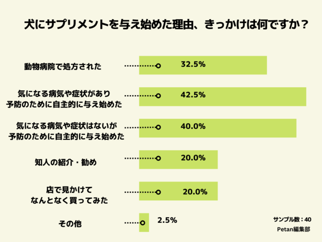 実際に愛犬にサプリメントを与えている飼い主さんに対して、きっかけ・理由を聞いたところ、「気になる病気や症状があり予防のために自主的に与え始めた」が42.5%、「気になる病気や症状はないが予防のために自主的に与