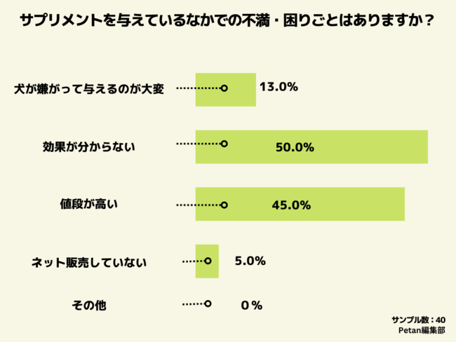 犬にサプリメントを与えている飼い主さんに「サプリメントを与えているなかでの不満・困りごと」を聞いたところ、「犬が嫌がって与えるのが大変」と回答した人は13.0%(5人/40人)のみでした。