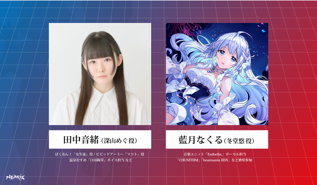 登場キャラクターの歌唱&ボイス担当には、信頼できるキャストの方々を起用させて頂きました。”深山めぐ”役には声優の「田中音緒」さん。”冬堂悠”役にはシンガーの「藍月なくる」さんにお願い致しました。