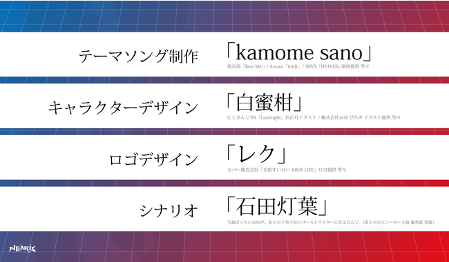 ロゴデザインにはアーケード音楽ゲーム等にもデザイン提供を行なっている「レク」様に制作をお願いし、シナリオ制作には”第26回スニーカー大賞 優秀賞”を受賞した「石田灯葉」さんにお願いさせて頂きました。豪華クリエイター陣の皆様のお力を借りつつ『NEARIS』の魅力が最大限にまで伝わるよう全力で制作に取り組みます。