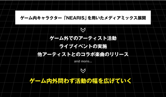 ゲーム内キャラクターとして二人組シンガーユニット「NEARIS(ユニット名)」を登場させる予定で、このNEARISの2人にはゲーム外でのアーティスト活動も行い、バーチャルアーティストとして活動の幅を広げていきます。