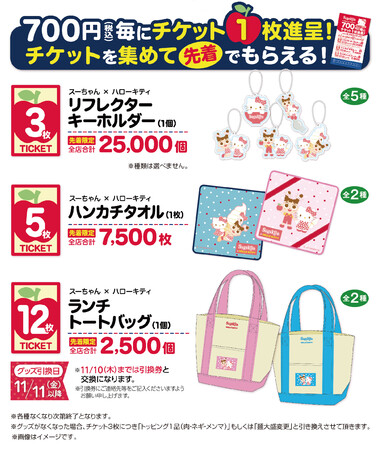 内容:スガキヤのキャラクター「スーちゃん」とサンリオのキャラクター「ハローキティ」がコラボした期間限定メニュー「アップルパイクリーム(税込390円)」や、お会計700円毎(※1)に進呈されるチケット(※2)を集めてもらえる限定コラボグッズ(リフレクターキーホルダー、ハンカチタオル、ランチトートバッグ)など(※3)が多数登場します。