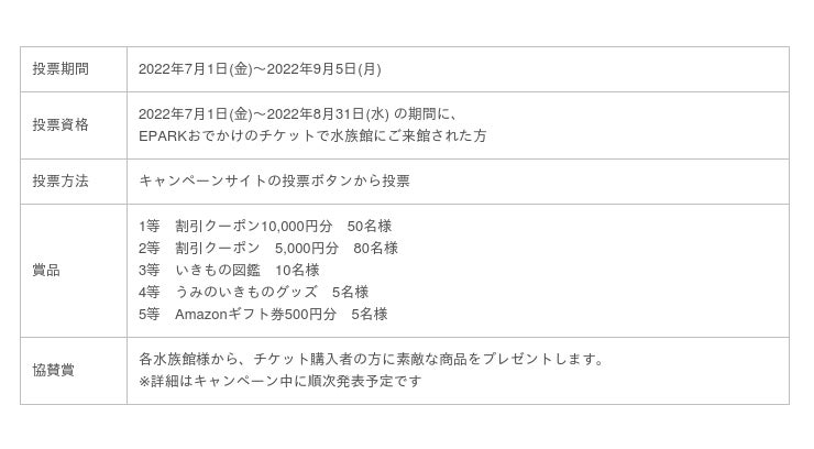 株式会社EPARKフィナンシャルパートナーズ(本社:東京都豊島区、代表取締役社長:津田 卓明)が運営する、スマートフォン1つでレジャー施設の電子チケットをおトクに事前購入できるサービス「EPARKおでかけ」(https://ticket.mamakoe.jp/)は、豪華賞品が当たる『うみのいきもの総選挙 2022』を、2022年7月1日(金)~2022年9月5日(月)まで開催します。