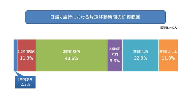 日帰り旅行における片道移動時間の許容範囲は2時間以内の43.5%が最も多い結果となり、1時間以内~2時間以内の合計は57.1%となりました。